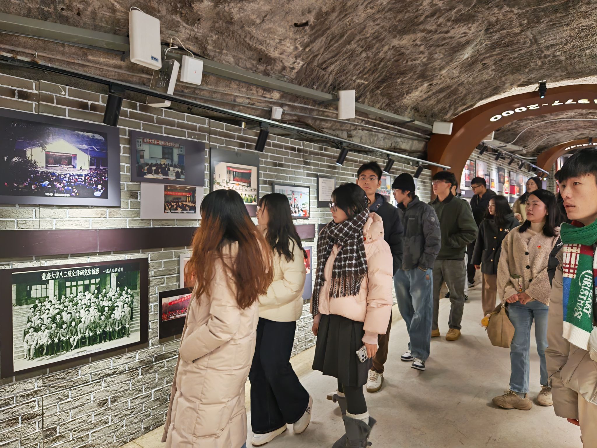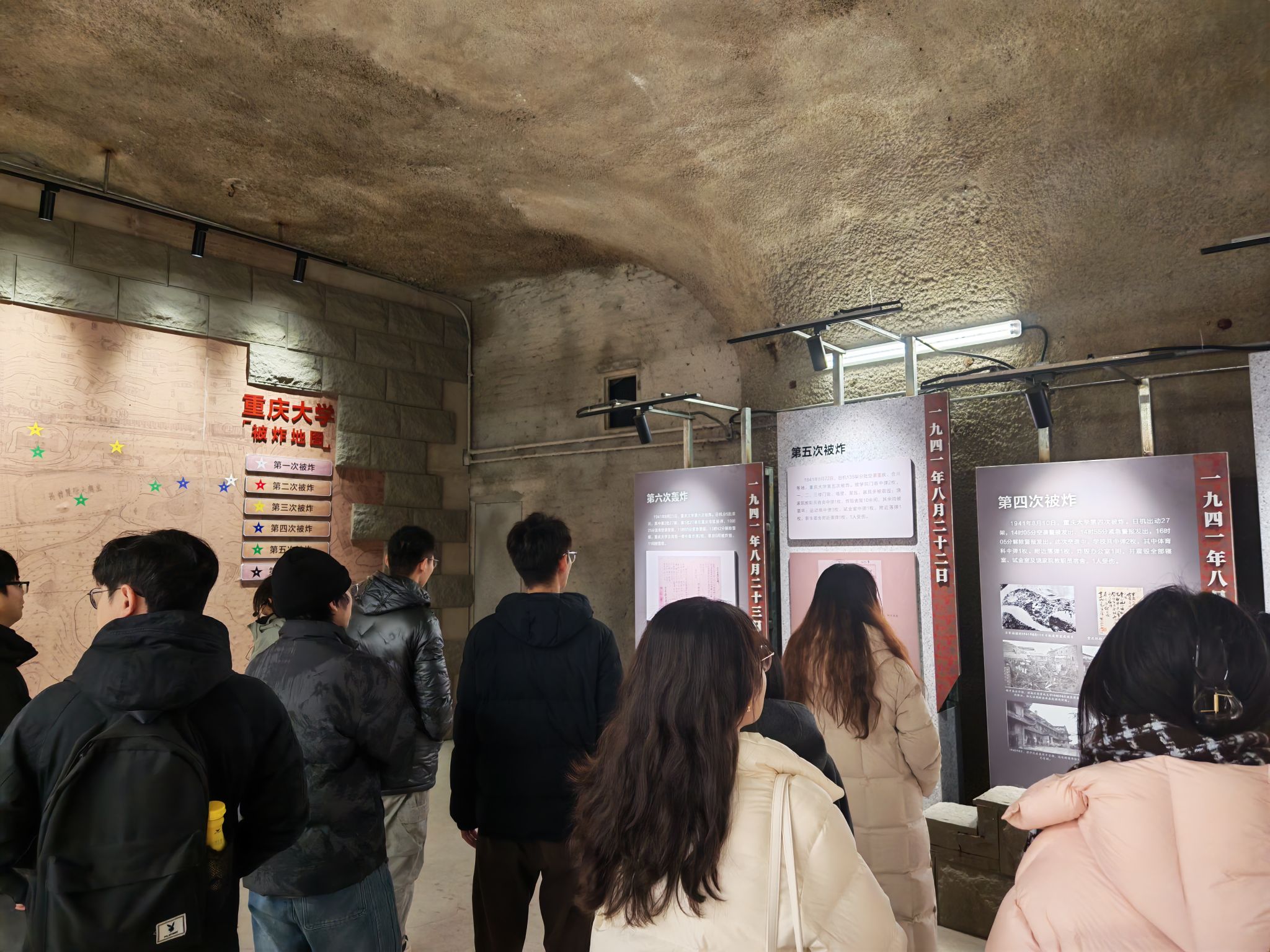 重庆大学防空洞始建于1937年,“三线建设”时期和20世纪80年代均进行过修缮,面积达1.4万平方米,是全国高校现存修建时间较早、规模最大的防空洞。据现有史料表明,从1939年至1941年,侵华日军对重庆实施大轰炸最残酷的三年时间里,重庆大学至少遭受了六次轰炸,大家眼前这片斑驳的岩壁曾是守护师生安全的生命屏障,更见证了重大人“敌毁我室,不毁我志”的铮铮铁骨。在讲解员的引领下,师生们穿行于错落有致的展陈空间,仿佛回到了那个在炮火中弦歌不辍、科研救国的特殊年代。对于重大人而言,这里不仅是避难所,更是赓续中华文脉的“特殊课堂”,生动诠释了学校“研究学术、造就人才、佑启乡邦、振导社会”的办学初心。