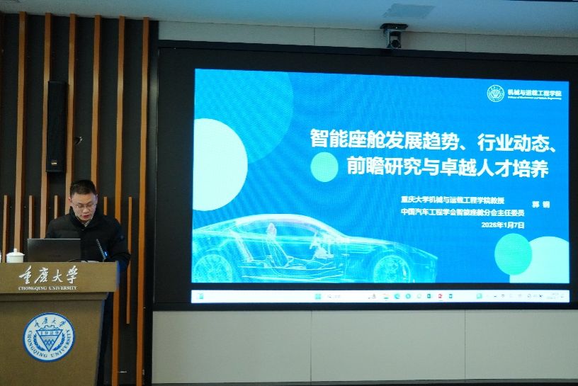 郭钢教授深度解读智能座舱技术与人才培养新范式1月7日,由重庆大学智能汽车技术学院主办的第二期“智能汽车大讲堂”在科学中心圆满落幕。本期大讲堂特邀重庆大学机械与运载工程学院郭钢教授重磅开讲,为全校师生带来一场兼具前沿视野、科研深度与实践价值的智能座舱深度报告,来自智能汽车技术学院、机械学院、计算机学院和艺术学院等学院的七十余位师生参与了此次活动。开讲之前,智能汽车技术学院执行院长宋朝省代表学院发表...
